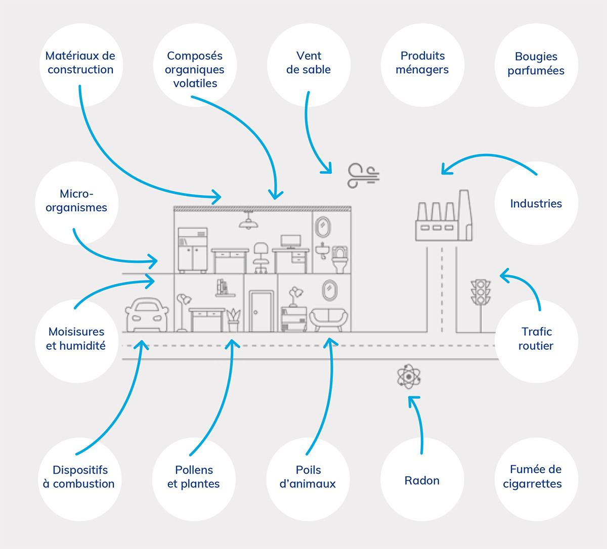 • les particules fines PM10-PM2.5-PM1.0, (composés organiques volatils, virus, bactéries, spores, moisissures,)
